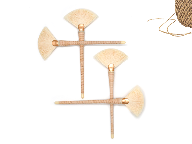 This is a (fan-shaped) makeup brush. The handle features a light brown rattan weave texture, with a gold-toned metal ferrule at the top. The overall style is simple and natural, and its unique appearance also possesses aesthetic appeal.